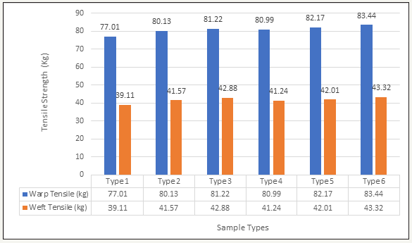 For doing tensile testing of the different types of samples obtained different results. For sample type 1, which was cut for the double cloth of a portion exposed the value of warp tensile 77.01kg and weft tensile 39.11kg and showed the results in the Figure 17. For sample type 2, the value was found warp tensile 80.13kg and weft tensile 41.57kg. For sample type 3, the value was found warp tensile 81.22kg and weft tensile 42.88kg. For sample type 4, the value was found warp tensile 80.99kg and weft tensile 41.24kg. For sample type 5, the value was found warp tensile 82.17kg and weft tensile 42.01kg. For sample type 6, the value was found warp tensile 83.44kg and weft tensile 43.32kg. It is seen from the Figure 17 that; higher tensile strengths are obtained for the fabrics of heavier weight and lower tensile strengths are obtained for the fabrics of lesser weights. It is clear that, heavier fabrics have more tensile strength.
